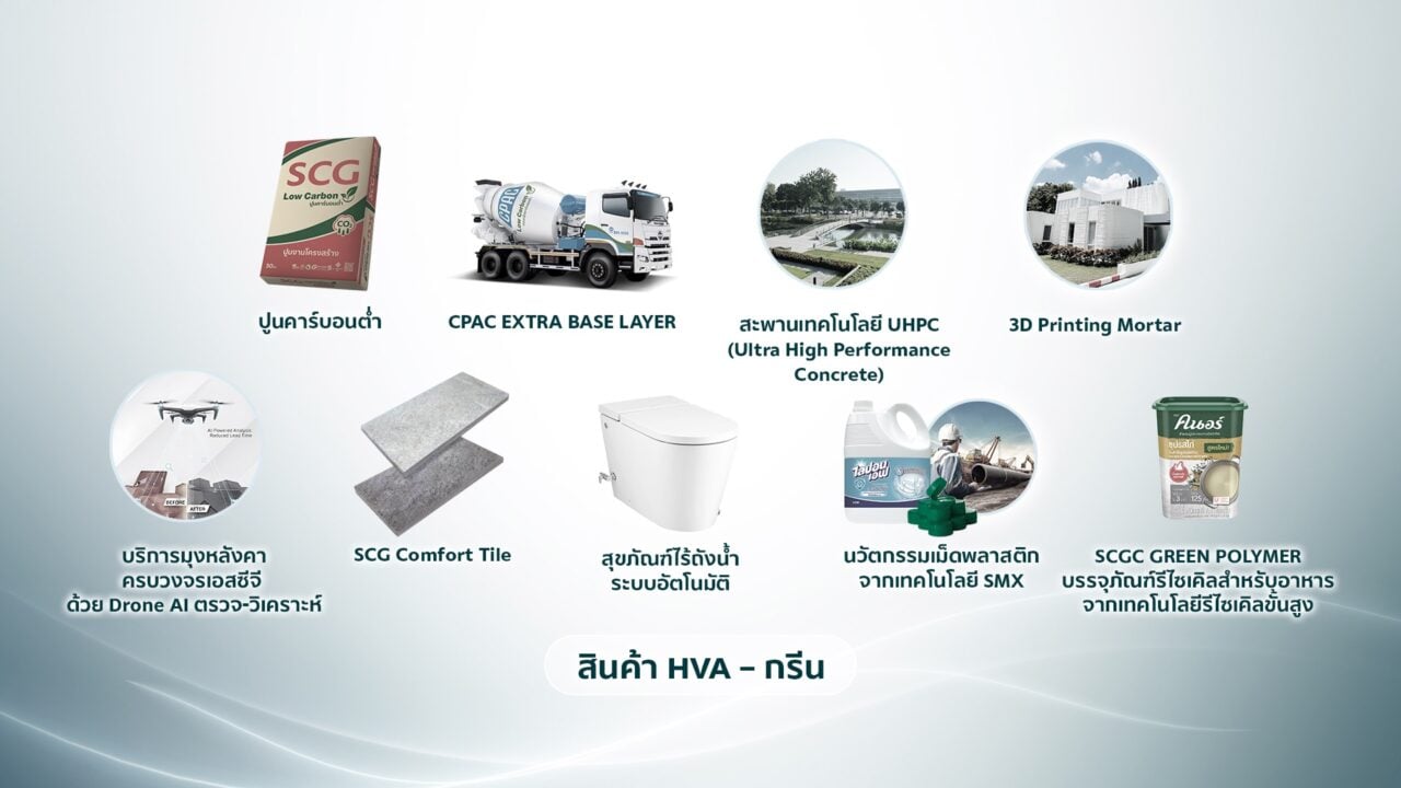เร่งเพิ่มกำลังผลิตสินค้ากรีนและสินค้ามูลค่าเพิ่มสูง (High Value Added Products-HVA) อาทิ ปูนคาร์บอนต่ำ ปูนคาร์บอนต่ำ  อยู่ระหว่างพัฒนาปูนคาร์บอนต่ำรุ่นใหม่ Generation 3 ที่ลดคาร์บอนไดออกไซด์ได้ถึง 38% โดยเตรียมปรับกำลังการผลิต 2 ล้านตัน/ปี ภายในปี 2570 ที่จ.สระบุรีและ CPAC Extra Base Layer นวัตกรรมซ่อม-สร้างถนนลดการยุบตัวและคงตัวทนนานจากการกัดเซาะน้ำ สะพาน UHPC (Ultra High Performance Concrete) สมรรถนะสูง ลดเวลาก่อสร้างได้ถึง 50% 3D Printing Mortar เทคโนโลยีการขึ้นรูปอาคารก่อสร้างที่มีดีไซน์ซับซ้อน ขยายตลาดไปญี่ปุ่น ซาอุดิอาระเบีย และมาเลเซีย ยกระดับ Roof Installation บริการมุงหลังคาครบวงจรเอสซีจี ด้วย Drone AI ตรวจรอยรั่วหลังคาและวิเคราะห์โครงสร้างแบบ 3 มิติ ช่วยให้ซ่อมแซมรวดเร็ว ปลอดภัย และแม่นยำยิ่งขึ้น SCG Comfort Tile กระเบื้องซีเมนต์ปูพื้นรายแรกในไทย ที่ลดความร้อนสะสมได้ 3–7°C ด้วย HeatSync Technology ให้พื้นเย็น เดินสบาย สุขภัณฑ์ไร้ถังประหยัดน้ำ DUACT และแบบ “เคลือบจากเปลือกไข่–หอย” ลดการปล่อยก๊าซเรือนกระจก นวัตกรรมเม็ดพลาสติกจากเทคโนโลยี SMX ช่วยลดความหนาของผลิตภัณฑ์ลงโดยยังคงความแข็งแรง พัฒนาเป็นสินค้าหลากหลาย เช่น ท่ออุตสาหกรรมเหมืองแร่ขนาดใหญ่ ฝาขวดน้ำอัดลม ถังบรรจุสารเคมี และบรรจุภัณฑ์สินค้าอุปโภคบริโภค นวัตกรรมพลาสติกรีไซเคิล ทั้งเทคโนโลยีรีไซเคิลเชิงกล และเทคโนโลยีรีไซเคิลขั้นสูง ซึ่งใช้ผลิตเป็นบรรจุภัณฑ์ Food Grade ปลอดภัย ผ่านการรับรองมาตรฐาน ISCC PLUS ครอบคลุมตลอดห่วงโซ่อุปทาน