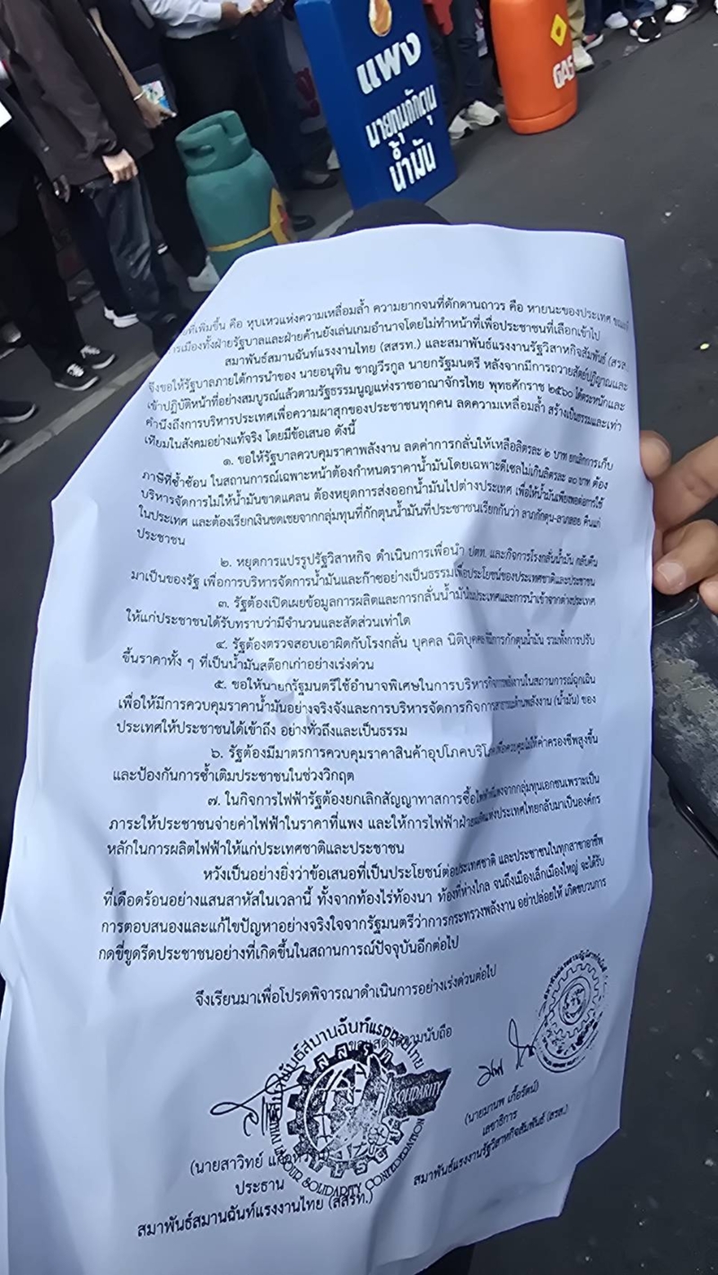 1.ขอให้รัฐบาลควบคุมราคาพลังงาน ลดค่าการกลั่นให้เหลือลิตรละ 2 บาท ยกเลิกการเก็บภาษีซ้ำซ้อน ในสถานการณ์เฉพาะหน้า ต้องกำหนดราคาน้ำมัน โดยเฉพาะดีเซล ไม่เกินลิตรละ 30 บาท ต้องบริหารจัดการไม่ให้น้ำมันขาดแคลน ต้องหยุดการส่งออกน้ำมันไปต่างประเทศ เพื่อให้น้ำมันเพียงพอต่อการใช้ในประเทศ และต้องเรียกเงินชดเชยจากกลุ่มทุนที่กักตุนน้ำมัน ที่ประชาชนเรียกกันว่า "ลาภกักตุน-ลาภลอย" คืนแก่ประชาชน